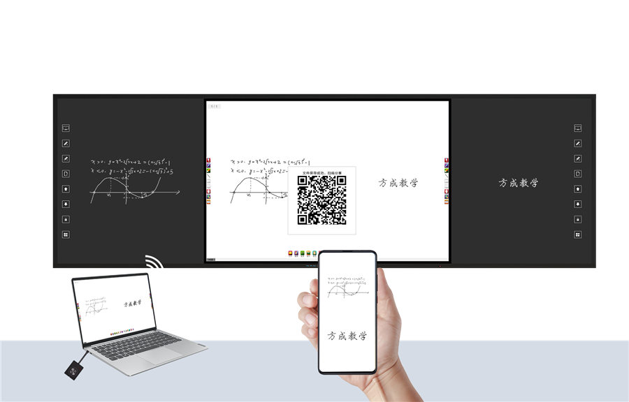 板書教學五同步: 同步書寫、同步顯示、同步擦除、同步保存、板書記憶雙系統同步,兩側可同時書寫,中間同步顯示,過程書寫無遮擋,還原板書過程。