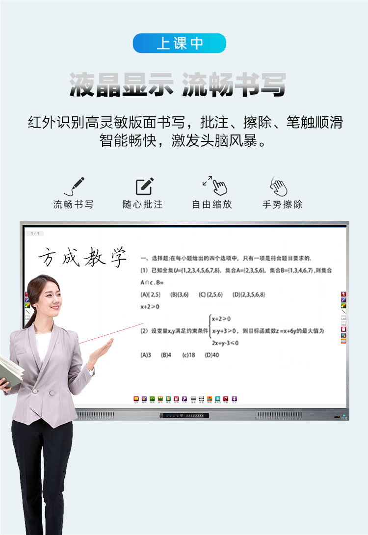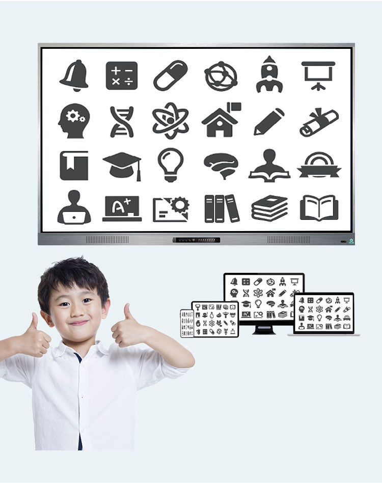 超窄邊多媒體教學(xué)一體機(jī)-超窄邊框三等邊超窄邊框設(shè)計,推拉門鎖保護(hù),4K超高清顯示,以人機(jī)交互的方式,搭載互動白板和無線投屏軟件,實現(xiàn)多人書寫、互聯(lián)互通的互動教學(xué)模式,豐富課堂內(nèi)容,提高學(xué)習(xí)氛圍。