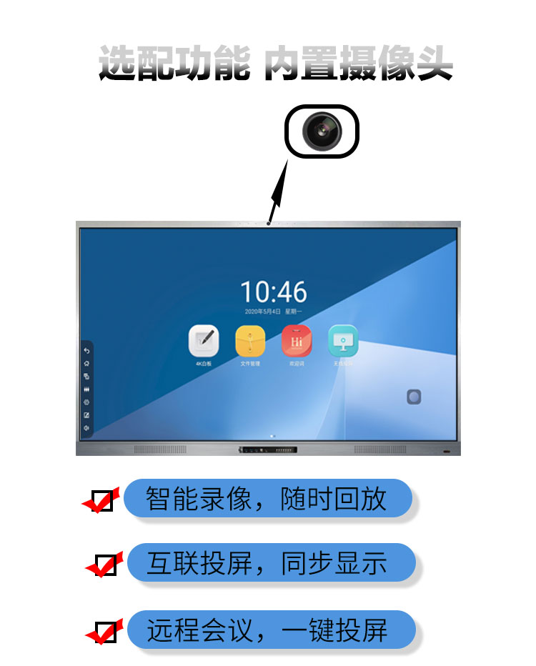 5、時尚精簡外觀,會議一鍵啟動(這條特點針對于S款不帶推拉門的會議平板一體機(jī),主要應(yīng)用在會議場所用)
